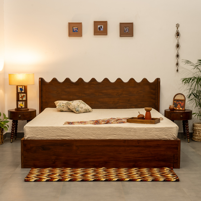 AALAYA is a sanctuary of serenity and form — a teakwood bed defined by its gracefully curved wave-like headboard, evoking a sense of rhythm and calm. Rooted in timeless craftsmanship and minimalist elegance, AALAYA brings warmth, flow, and quiet luxury to the bedroom, making it a true place of rest and retreat.