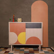 Fun and functional, this mid-century modern cabinet pops with colour and style. Hand-painted shutters are inspired by the Tangram puzzle giving a modern twist. The cabinet is useful, practical and eye-catching and can function as an office cabinet, entertainment unit or even a bar cart. Clean lines and rounded legs produce a delightful silhouette, making it a chic accent piece in any layout.
