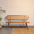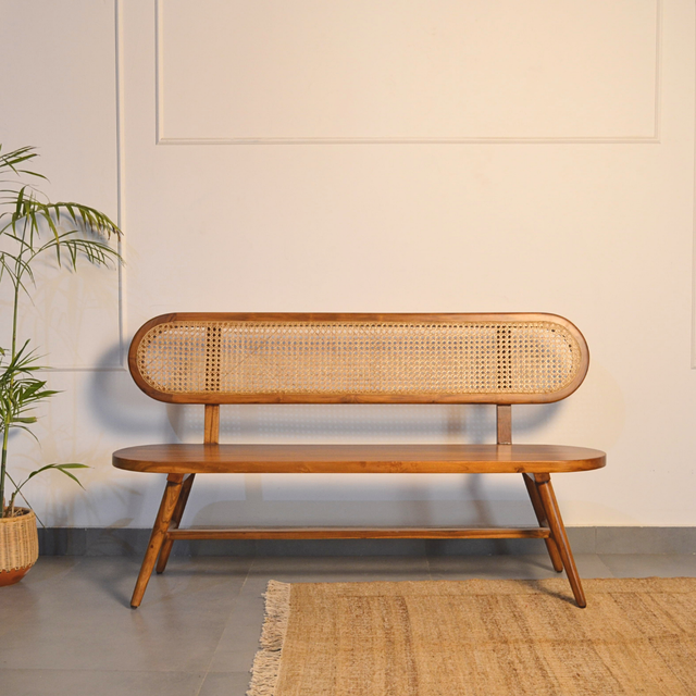 The Solace Bench brings lightness to form and function. Its gently curved teak frame is paired with a handcrafted cane backrest that adds texture and breathability. The design is simple, open, and inviting, perfect for an entryway, dining nook, or quiet corner. It’s a piece that feels as easy as it looks.