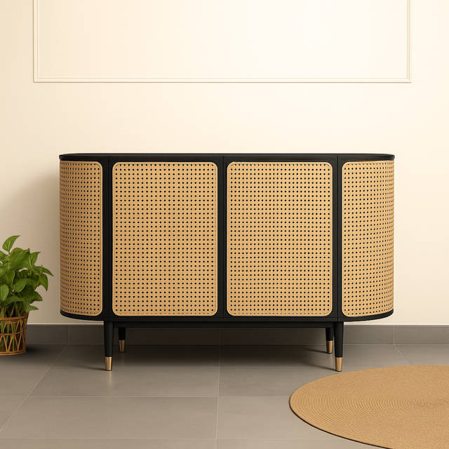 The Taru Storage Cabinet is where clean form meets organic detail. Wrapped in handwoven natural indian cane and framed in a bold matte black structure, it brings depth and texture to any space. The curved edges soften its presence, while brass-tipped legs add a hint of elegance. Inside, it’s all about function, ample storage hidden behind beautifully detailed shutters and drawers. Ideal for keeping things tucked away without compromising on style.