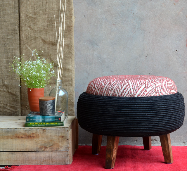 The colours of love and a combination to fall in love with-Red and Black; makes this upcycled ottoman one to choose for your living area or veranda. We have chosen a hand-knitted base and cushion for you with jet-black rope coated on a tyre with a reliable base. This upcycled ottoman is different in terms of its colour pattern and texture and is sure to be loved by your guests and visitors.