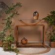 The dynamic appeal of the form and glass top makes this console table a stunning element for your interiors. The spacious Arched-in sides allow you to place small accent pieces, and books while the glass top accentuates the look of decor accessories kept over it. The fusion of elegant teakwood with the cane will surely add a fresh spark to your space.
