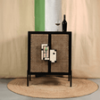 Introducing our striking black bar cabinet, designed to captivate with its bold aesthetic. The cane detailing on the shutter adds a touch of texture and sophistication, while the handles feature a unique mosaic tile pattern adorned with charming bird motifs. Elevate your space with this fusion of contemporary design and artisanal craftsmanship, making a statement that is both classy and functional.