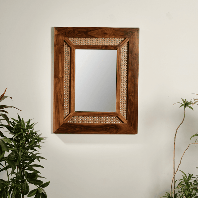 This unique piece combines the warmth of natural wood with the intricate texture of cane, resulting in a striking geometric frame that elevates any room. With its sleek design and artisanal cane appeal, this mirror is more than just a reflection it's a statement of style and sophistication.